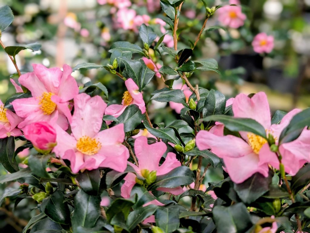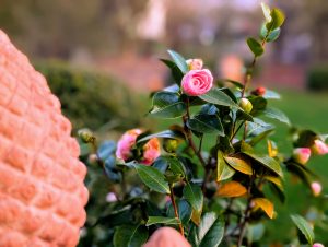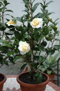Kamelien gehören ohne Zweifel zu meinen Lieblingspflanzen und jetzt im Herbst ist die beste Zeit, um neue Kameliensträucher zu pflanzen. Aber auch wer Kamelien im Topf kultivieren möchte, findet jetzt eine reiche Auswahl an verschiedenen Sorten, die sich in winterfesten Töpfen auf der Terrasse hübsch arrangieren lassen, um auch in der trüben und dunklen Jahreszeit nicht auf attraktive Terrassengestaltung verzichten zu müssen. Den Topf warm verpackt, können Kameliensträucher den Winter auf der Terrasse verbringen, wenn die meisten anderen Kübelpflanzen in das Winterquartier umziehen müssen. Im Winter zieht das dichte, dunkelgrüne Blattwerk den Blick hinaus auf die Terrasse und im zeitigen Frühjahr, wenn Blüten noch recht selten sind und daher umso sehnsüchtiger erwartet werden, warten Kameliensträucher sowohl auf der Terrasse als auch im Garten mit wunderschönen Blüten auf, die den Rosenblüten nicht nachstehen.